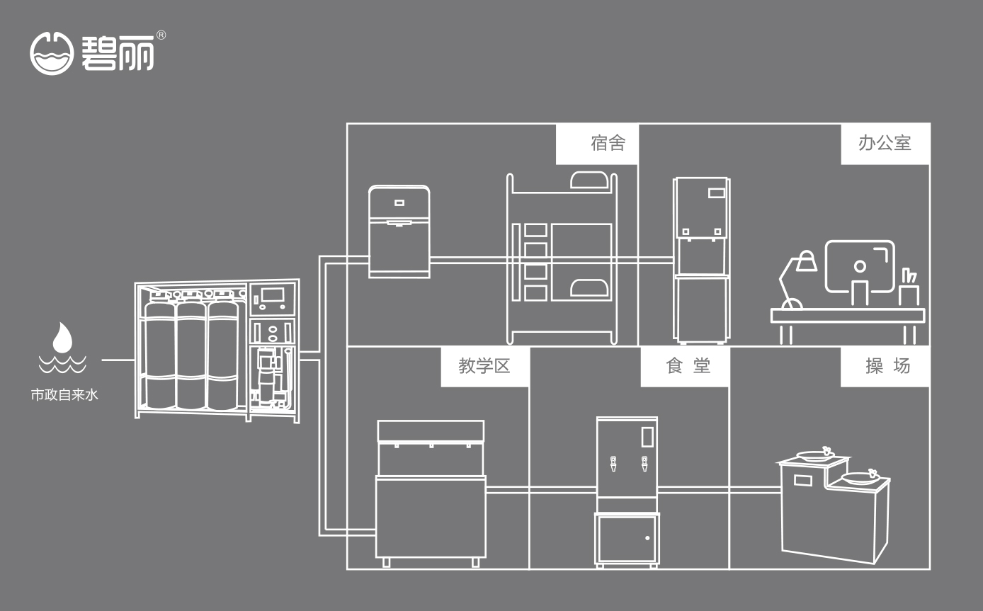 碧麗商用反滲透純水機(jī)將自來水集中處理后,把優(yōu)質(zhì)的純凈水通過專用的供水管道輸送到各飲水點(diǎn);