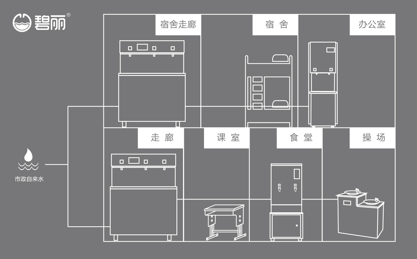 全自動化處理統(tǒng)一供水,供水量大,解決場所使用人數(shù)多,需求多個飲水點的情況;