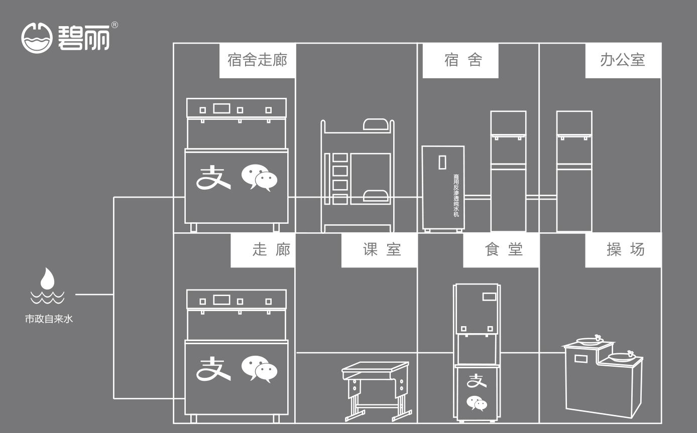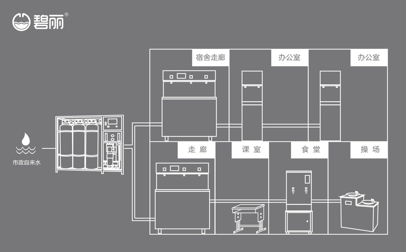 碧麗大型反滲透純水設備將自來水集中處理后,把優(yōu)質(zhì)的純凈水通過專用的供水管道輸送到各飲水點;