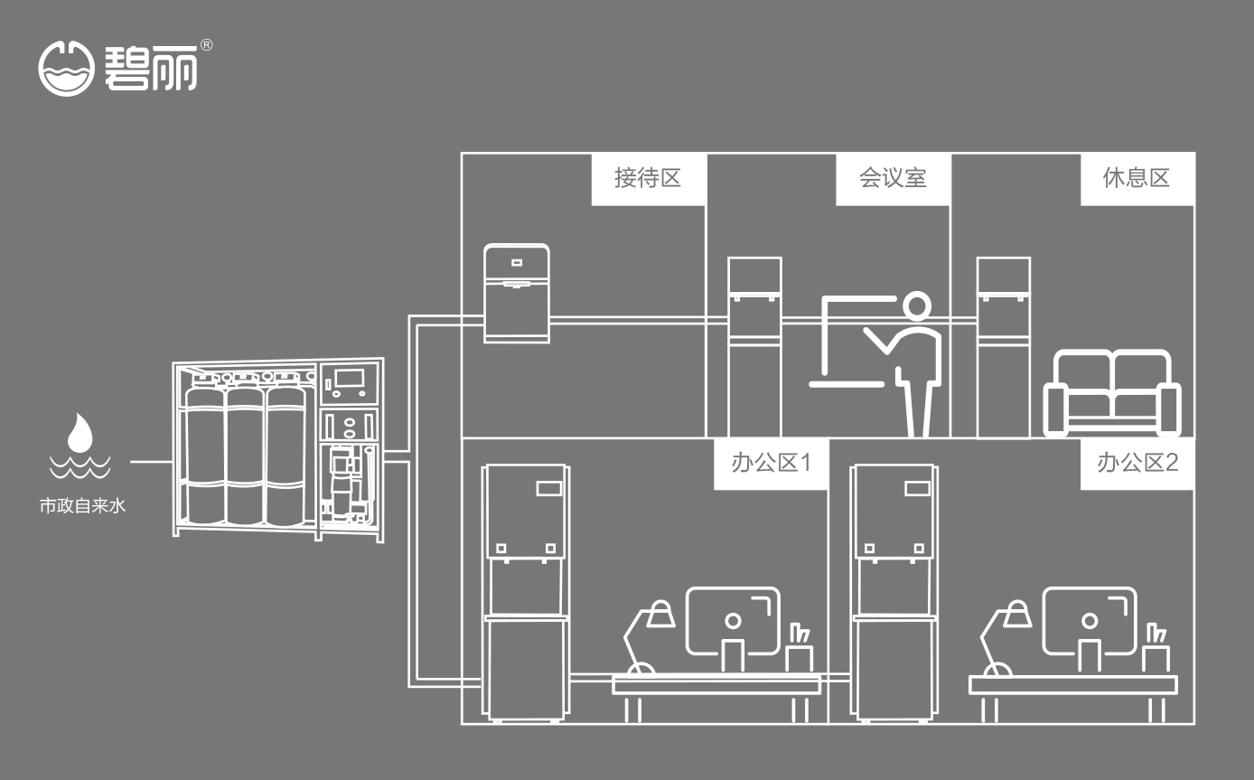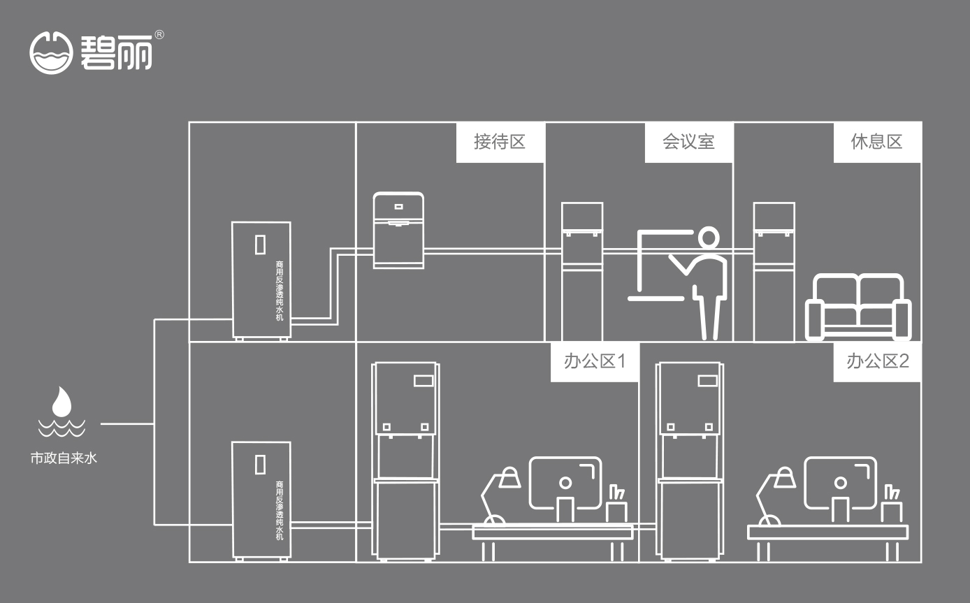 碧麗商用反滲透純水機將自來水集中處理后,把優(yōu)質(zhì)的純凈水通過專用的供水管道輸送到各飲水點;